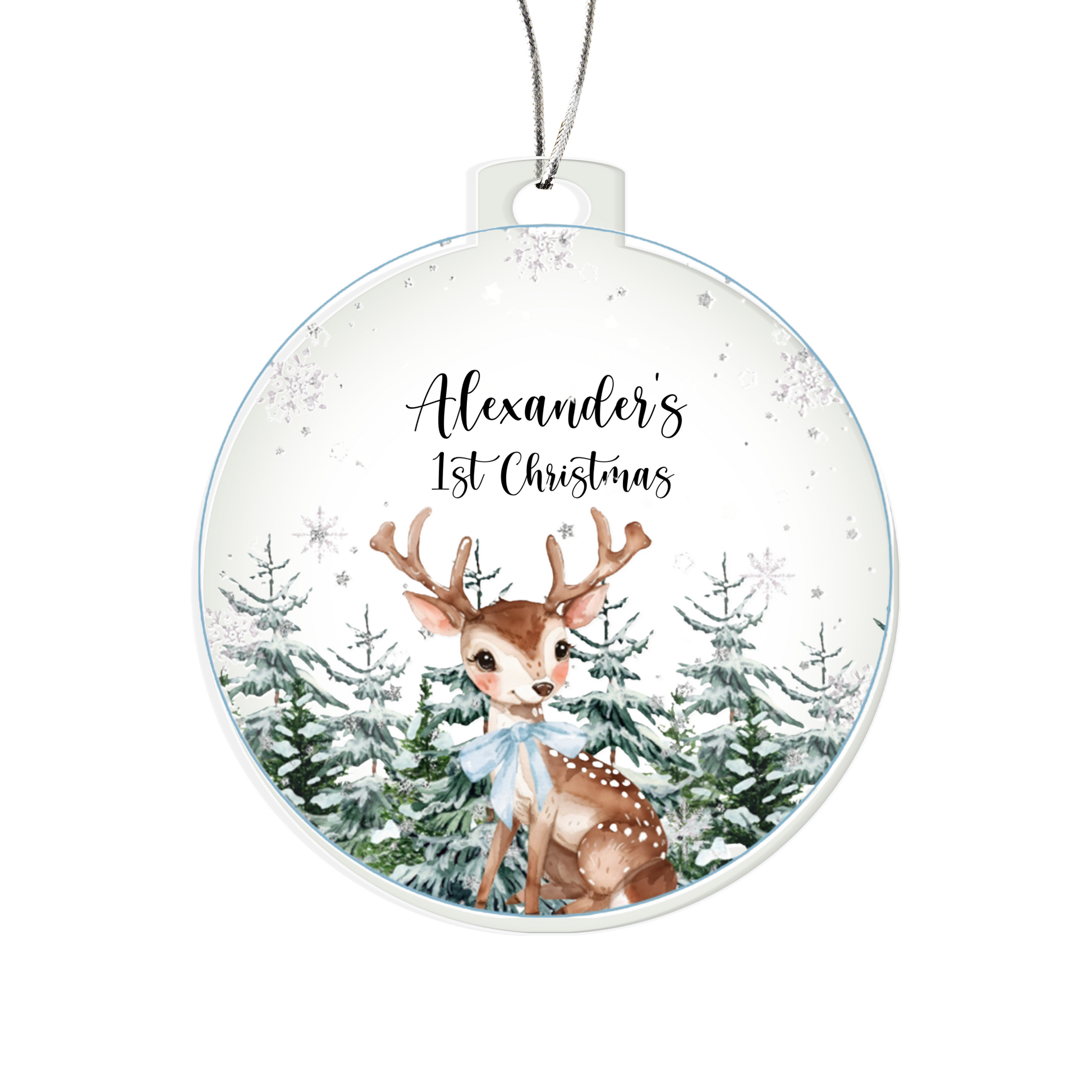 🎄 Celebrate your little one's first Christmas with our adorable Personalized Acrylic Ornament! Featuring a charming illustration of a cute reindeer with a soft blue bow, nestled among beautifully detailed snow-covered pine trees and delicate snowflakes all around, this ornament captures the magic of a baby's first holiday season.