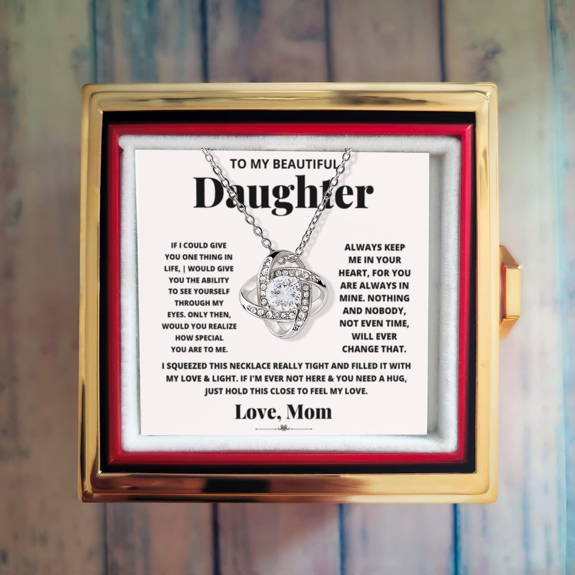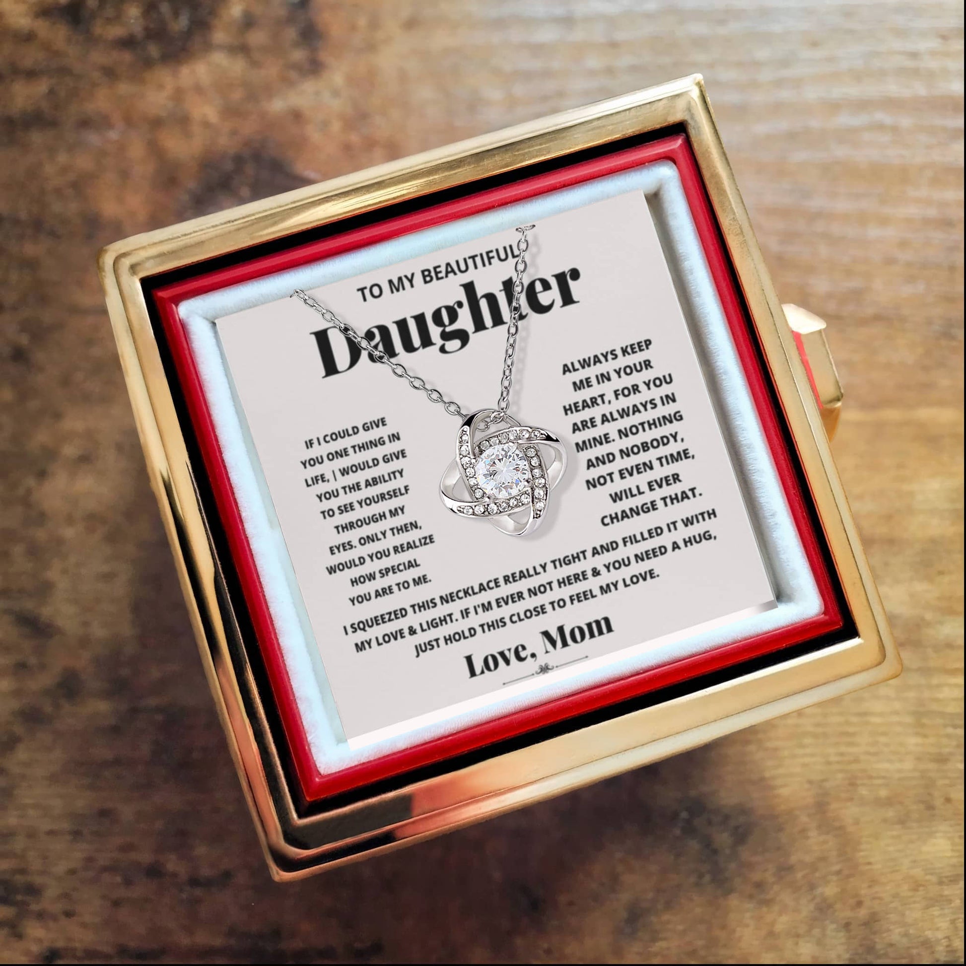 Imagine her reaction as she receives this beautiful Love Knot Necklace. Representing an unbreakable bond between two souls, this stunning pendant is adorned with premium cubic zirconia crystals, making it a timeless symbol of love and devotion. The luxurious box, featuring a meticulously preserved rose that never fades, adds an extra touch of love. With a simple turn of the gold knob, her breathtaking gift is revealed—making it the perfect sentimental gift for that special someone.