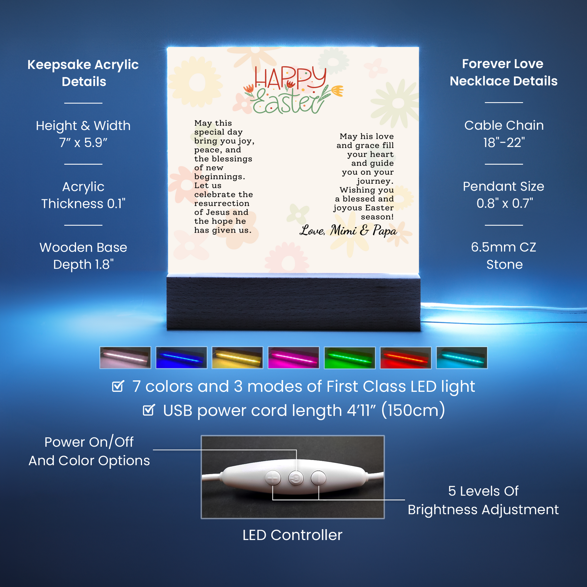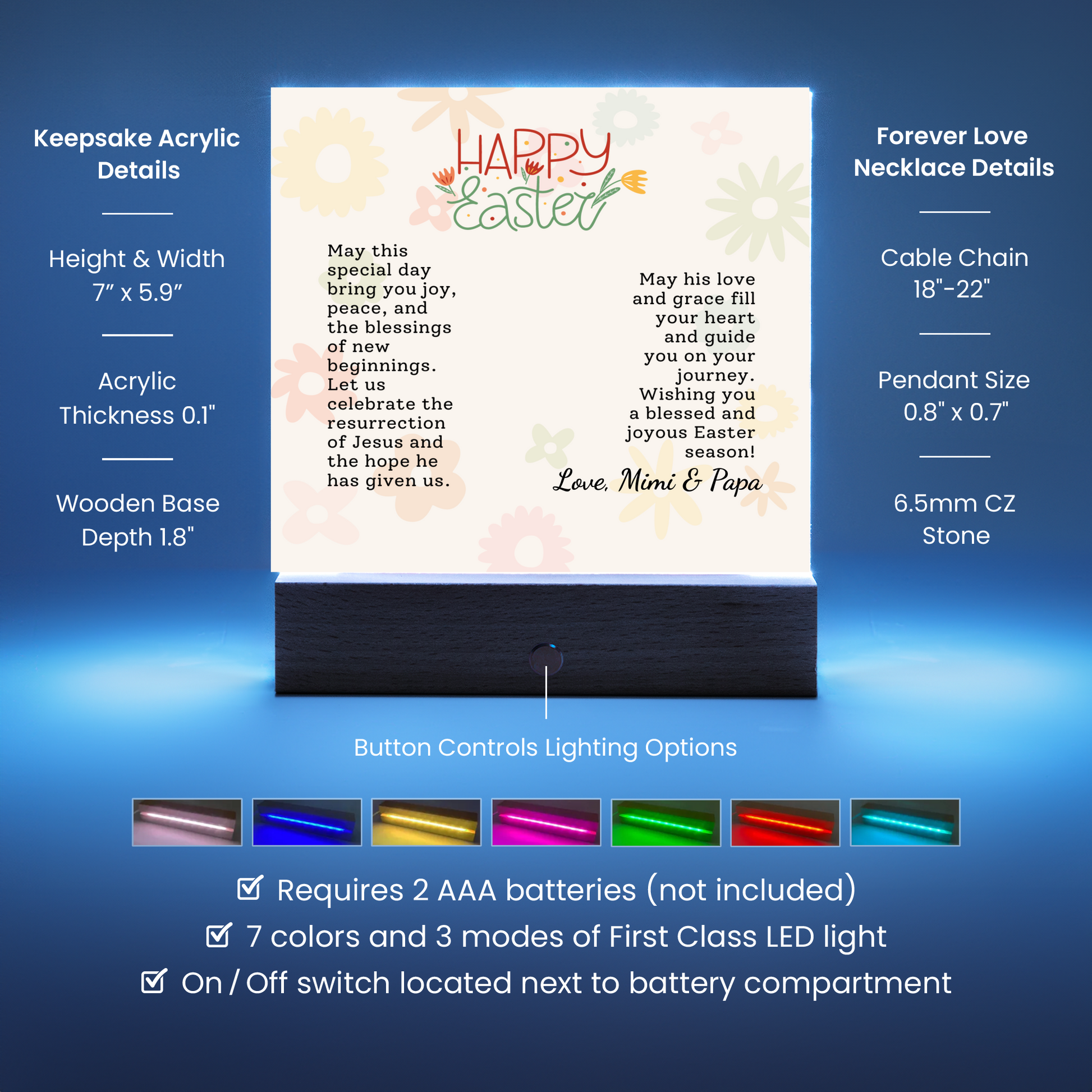 Your Keepsake Acrylic comes with a stylish wooden LED base, and you can choose between a USB plug-in option OR a cordless battery-operated option (requires 2 AAA batteries, not included). Both LED bases feature 7 vibrant colors, allowing the user to customize the lighting with various color changes and dynamic cycles.