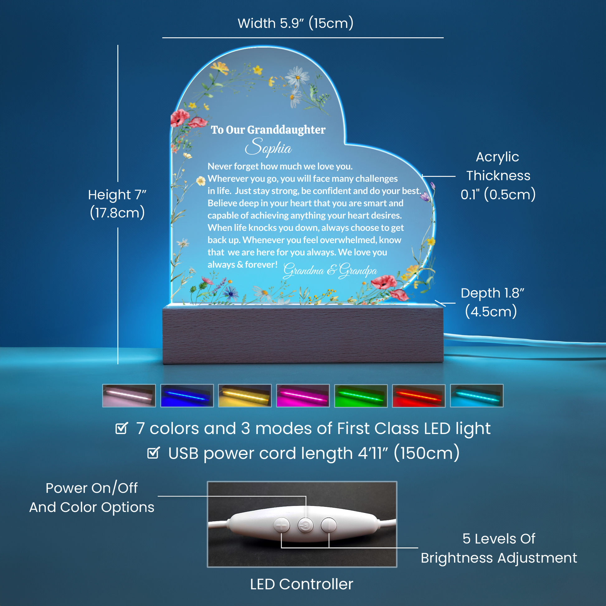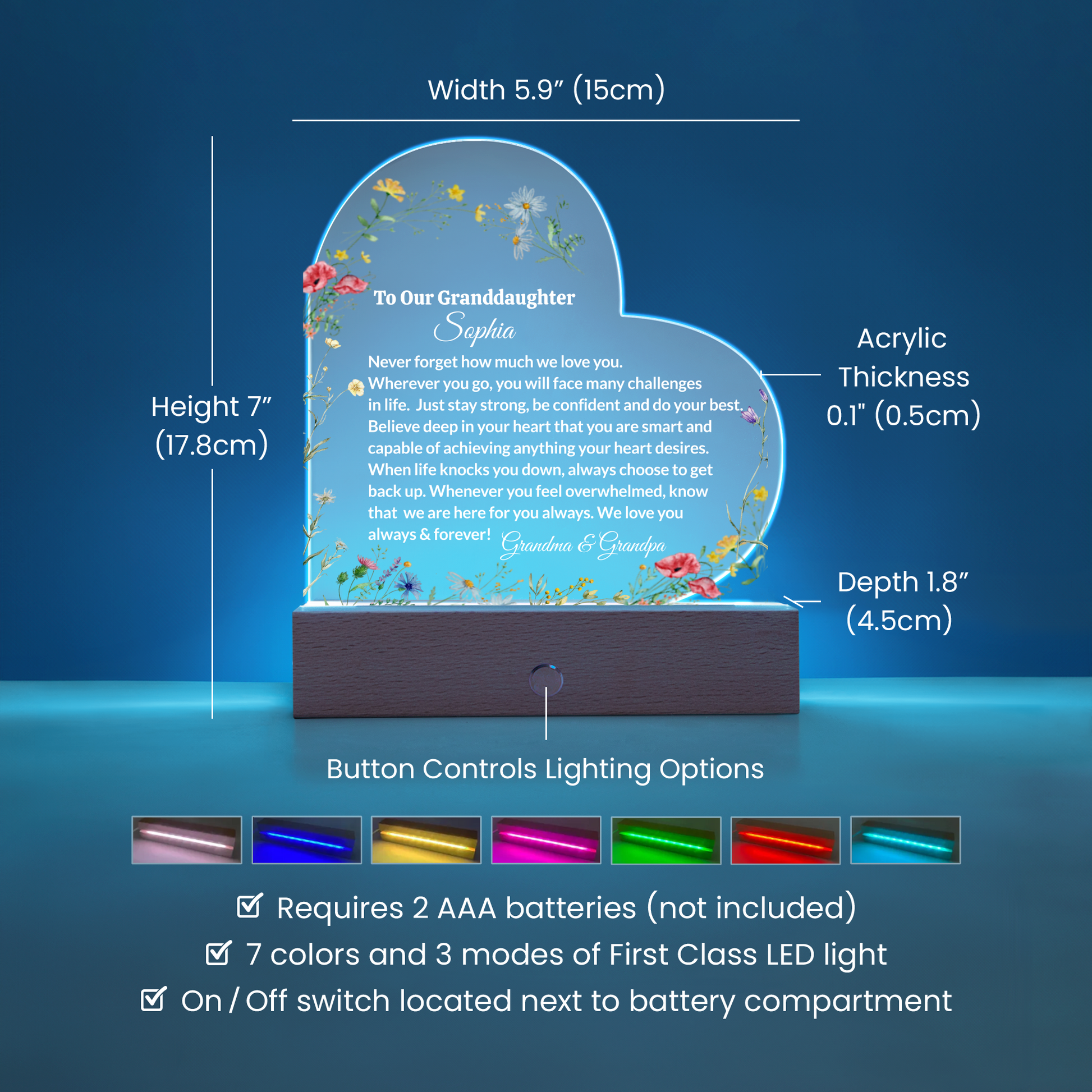 Your plaque will be crafted from premium acrylic with a professionally printed design for a polished look. It comes with a stylish wooden LED base, and you can choose between a USB plug-in option OR a cordless battery-operated option (requires 2 AAA batteries, not included). Both LED bases feature 7 vibrant colors, allowing the user to customize the lighting with various color changes and dynamic cycles.