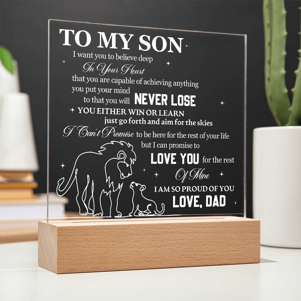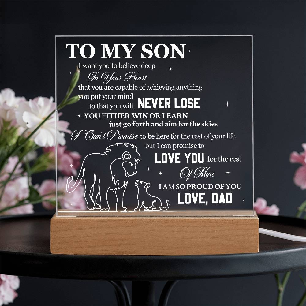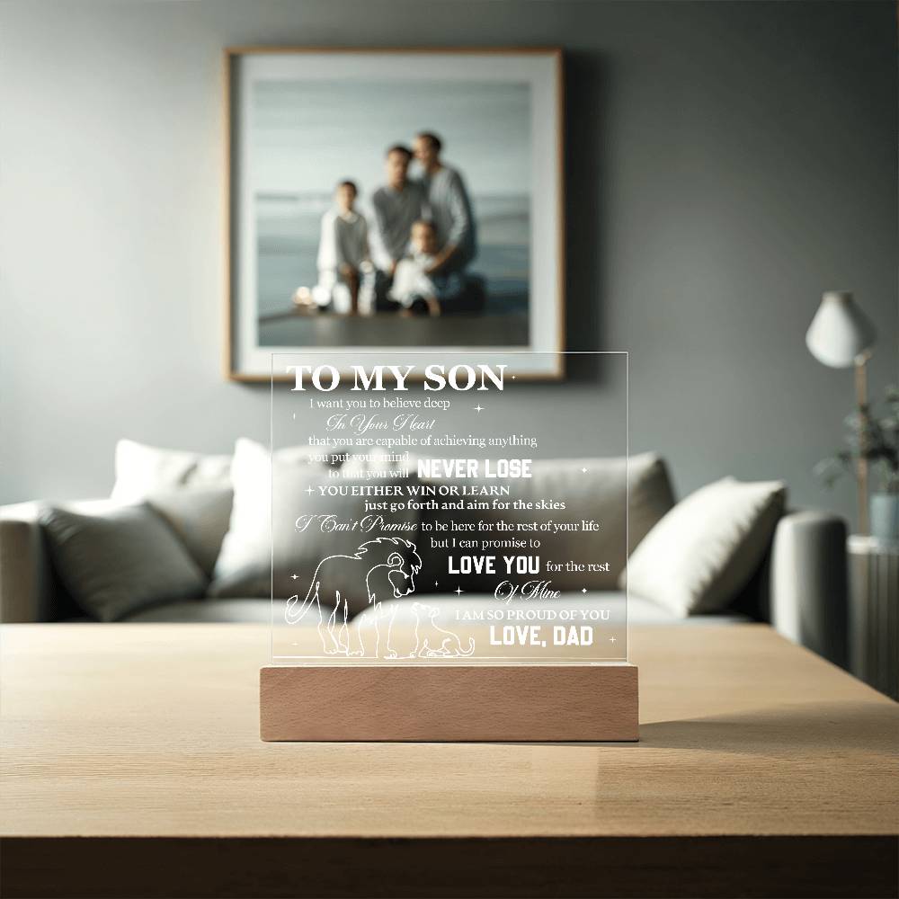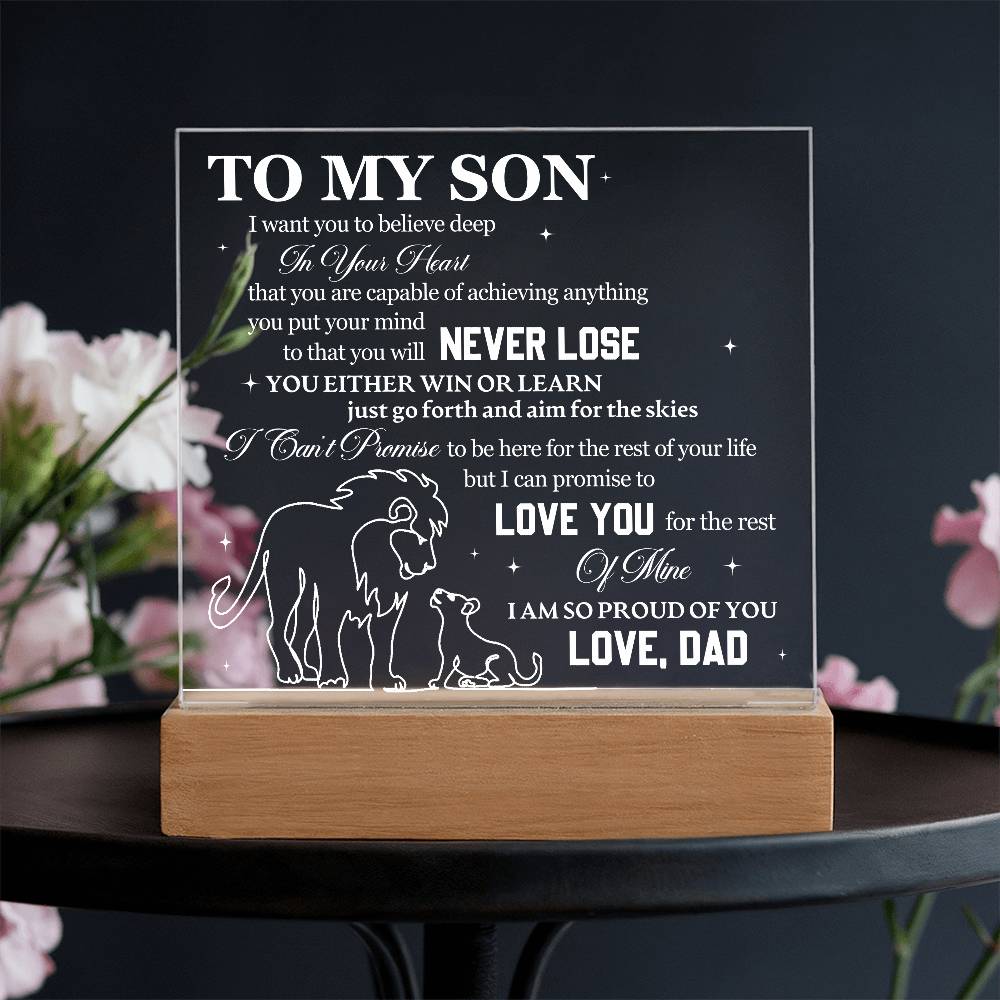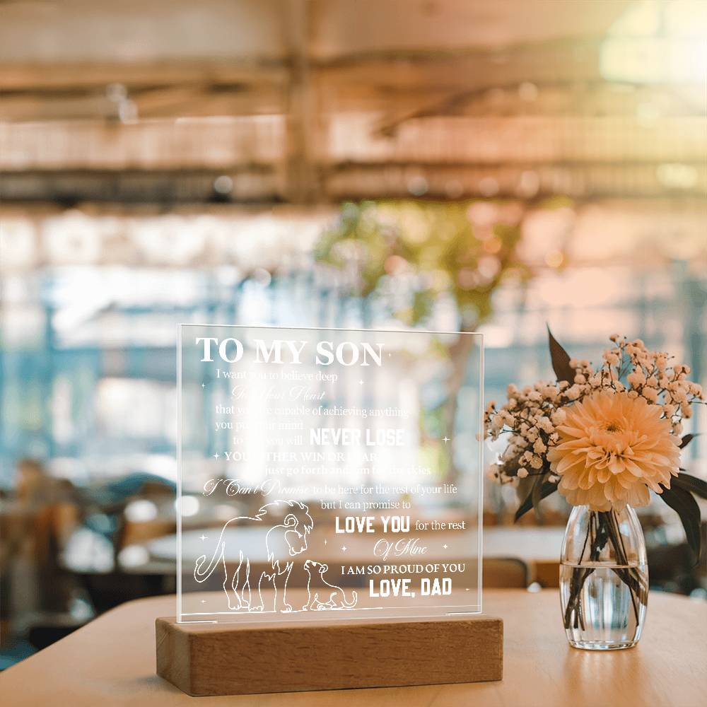 Your plaque will be crafted from premium acrylic with a professionally printed design for a polished look. It comes with a stylish wooden LED base, and you can choose between a USB plug-in option OR a cordless battery-operated option (requires 2 AAA batteries, not included). Both LED bases feature 7 vibrant colors, allowing the user to customize the lighting with various color changes and dynamic cycles.
