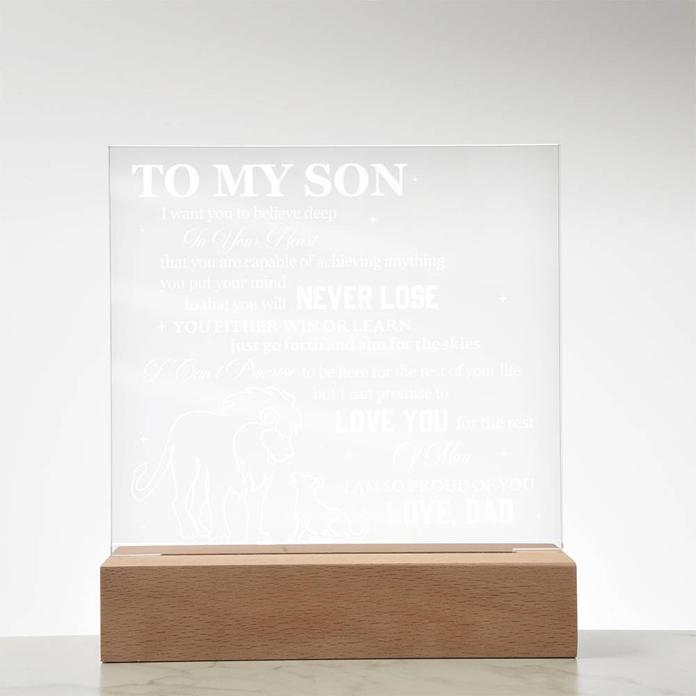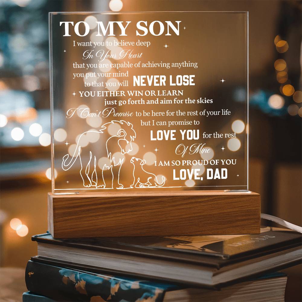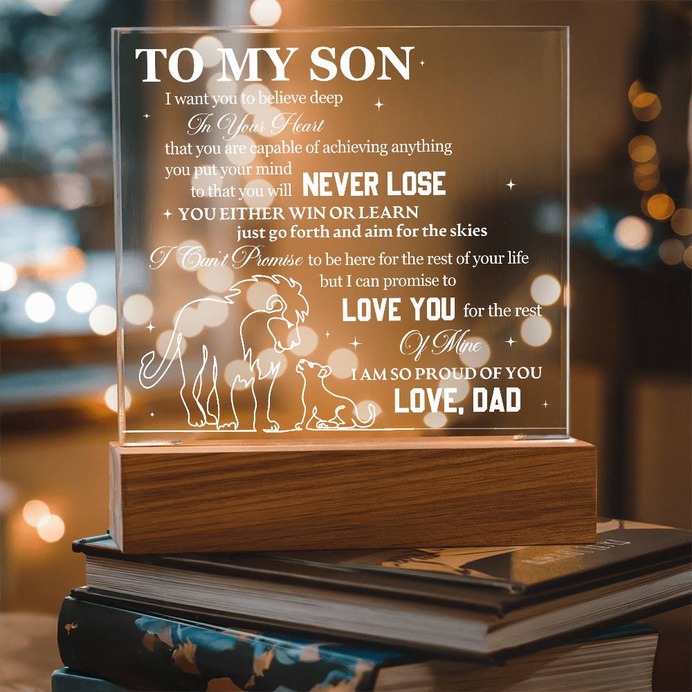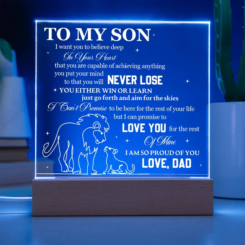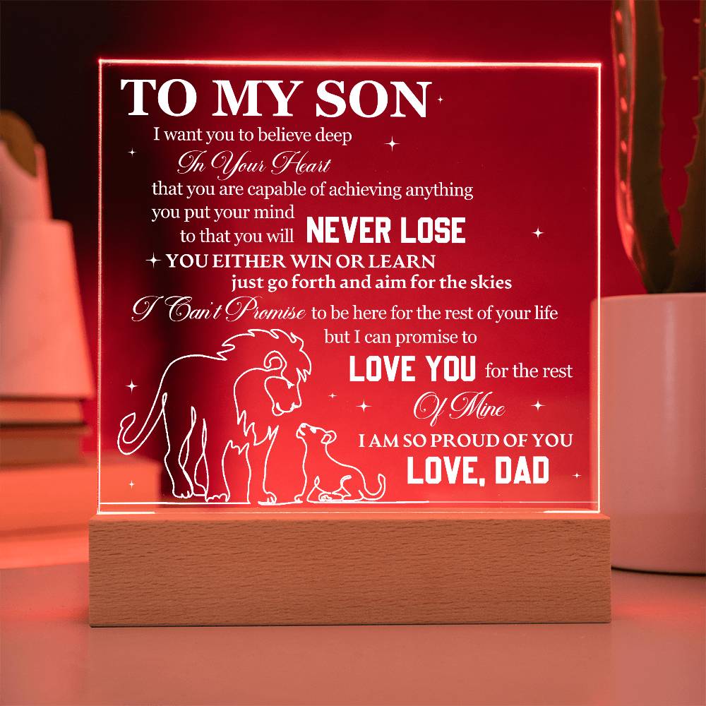 Your plaque will be crafted from premium acrylic with a professionally printed design for a polished look. It comes with a stylish wooden LED base, and you can choose between a USB plug-in option OR a cordless battery-operated option (requires 2 AAA batteries, not included). Both LED bases feature 7 vibrant colors, allowing the user to customize the lighting with various color changes and dynamic cycles.