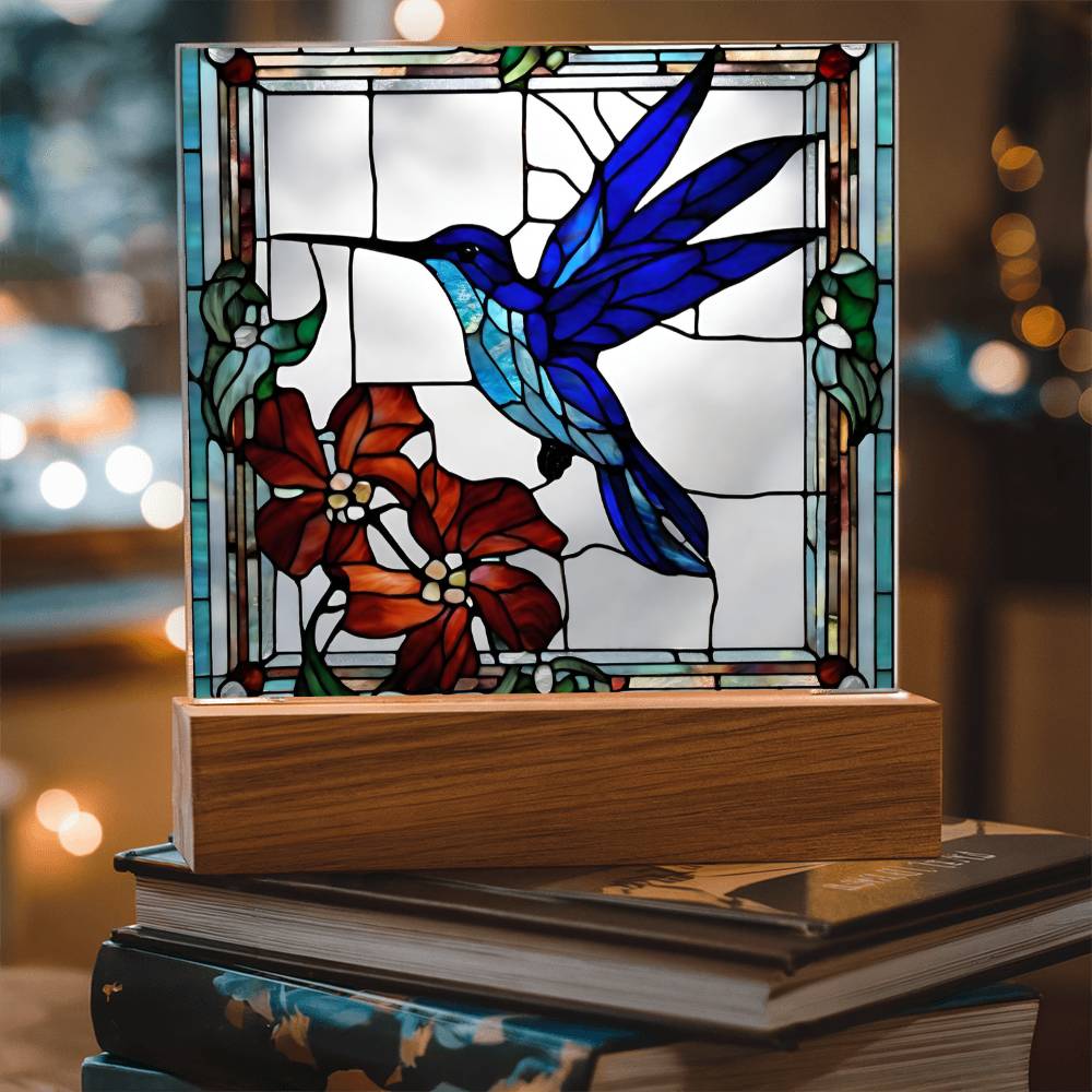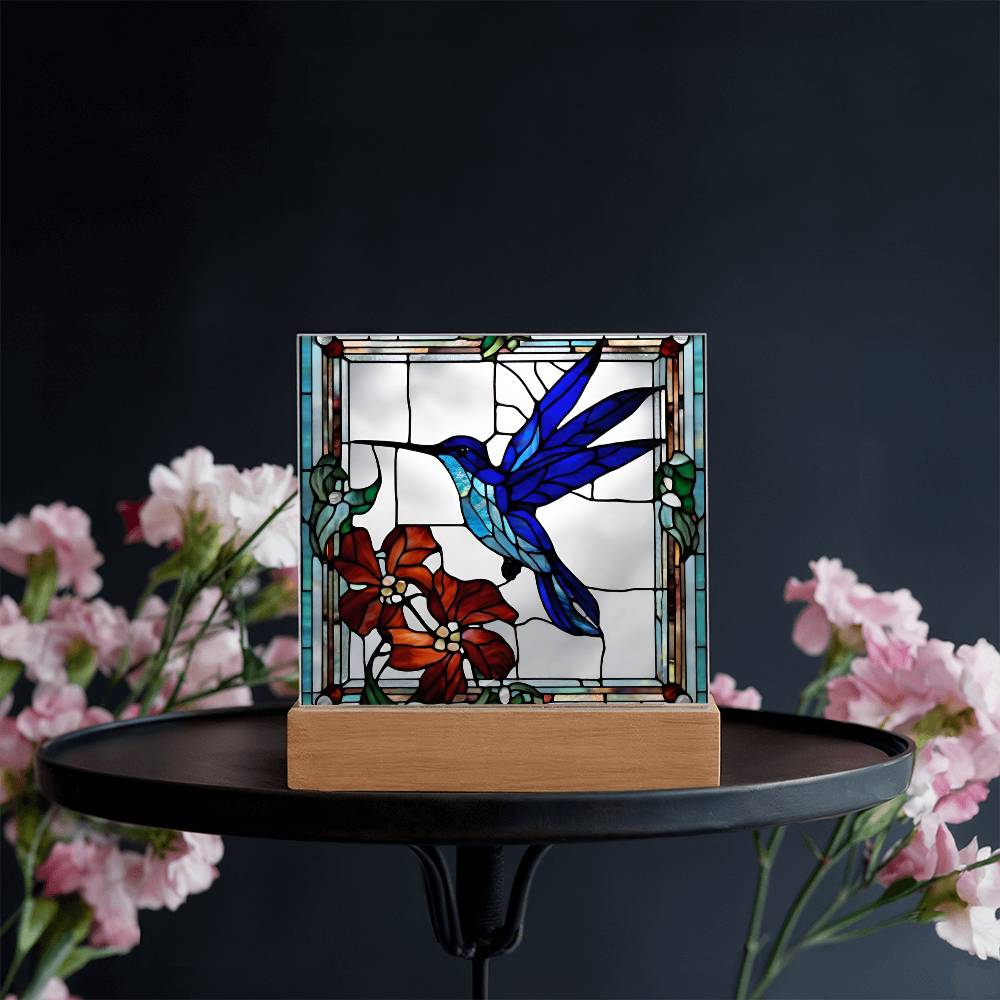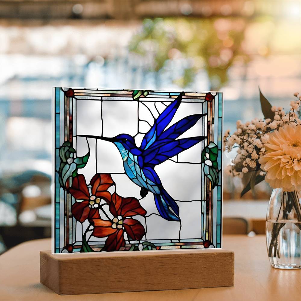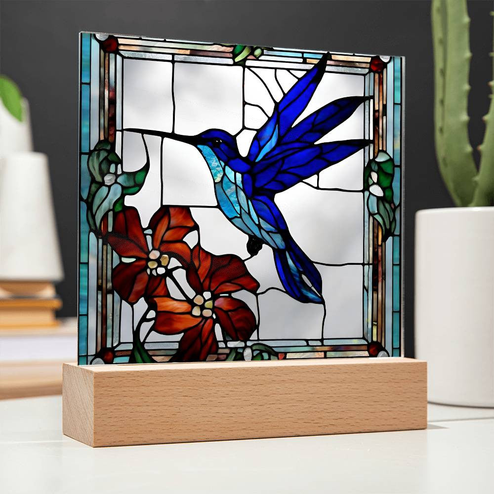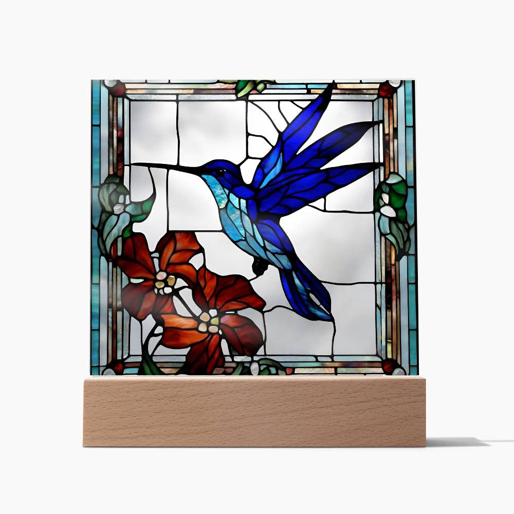Hummingbird Flowers Faux Stained Glass LED Acrylic Plaque