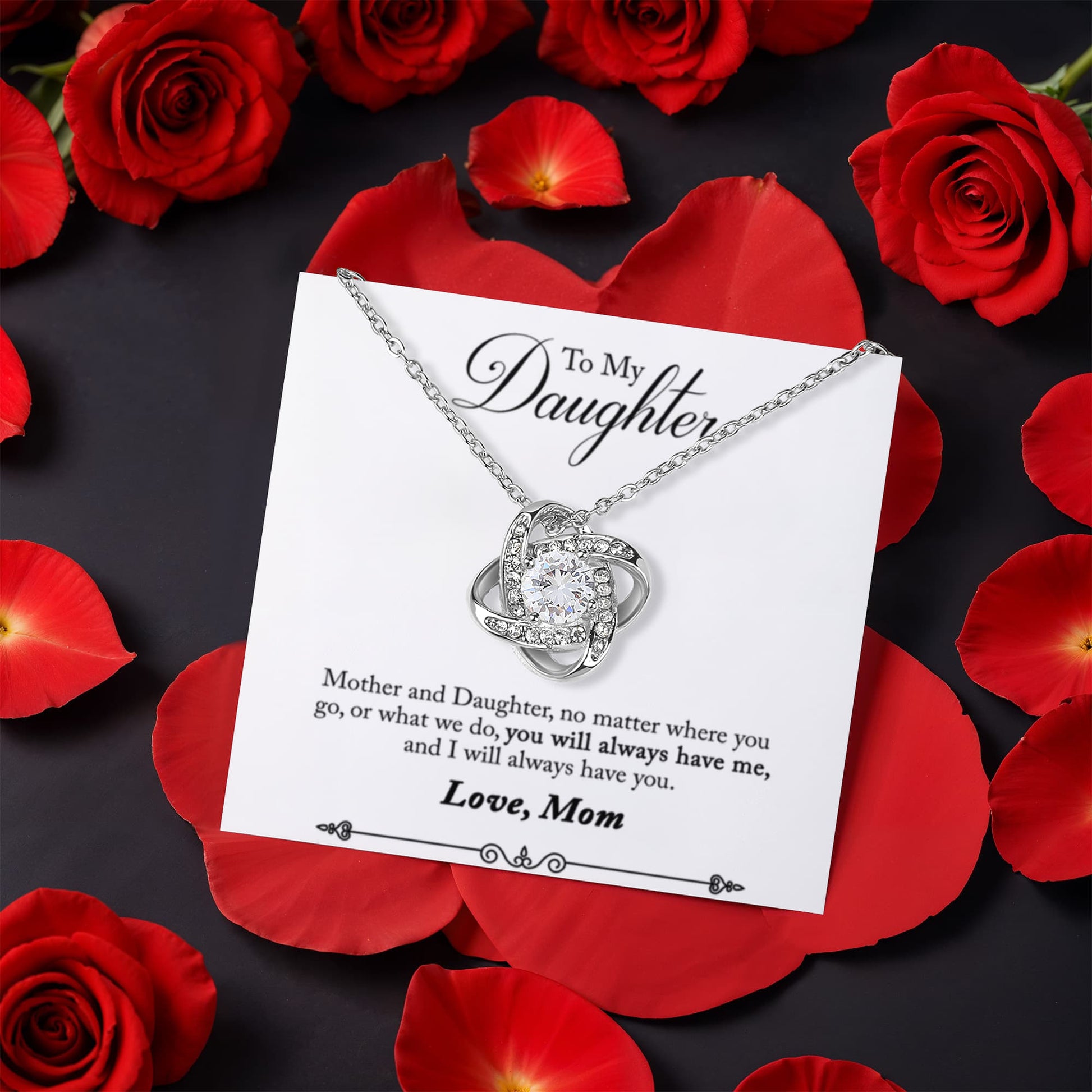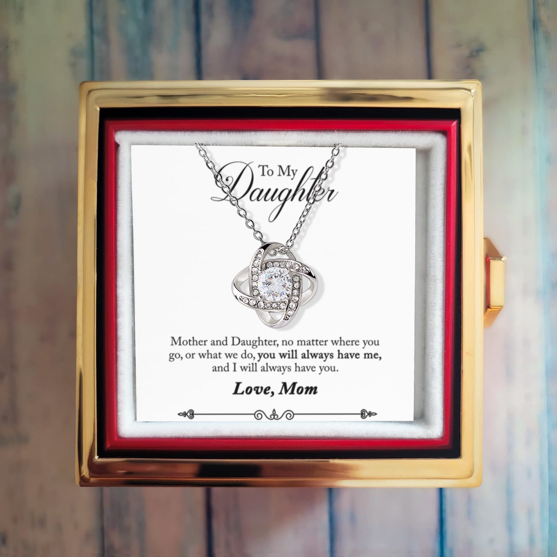Imagine her reaction as she receives this beautiful Love Knot Necklace. Representing an unbreakable bond between two souls, this stunning pendant is adorned with premium cubic zirconia crystals, making it a timeless symbol of love and devotion. The luxurious box, featuring a meticulously preserved rose that never fades, adds an extra touch of love. With a simple turn of the gold knob, her breathtaking gift is revealed—making it the perfect sentimental gift for that special someone.