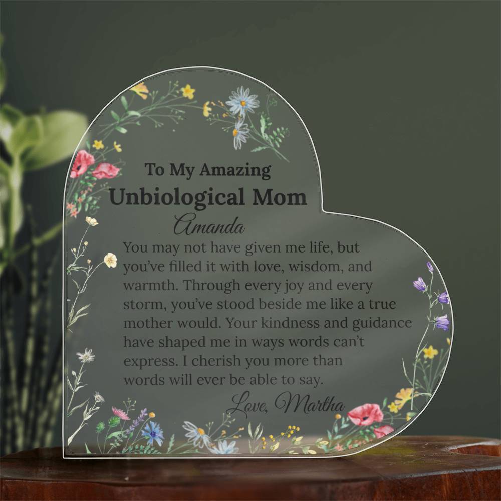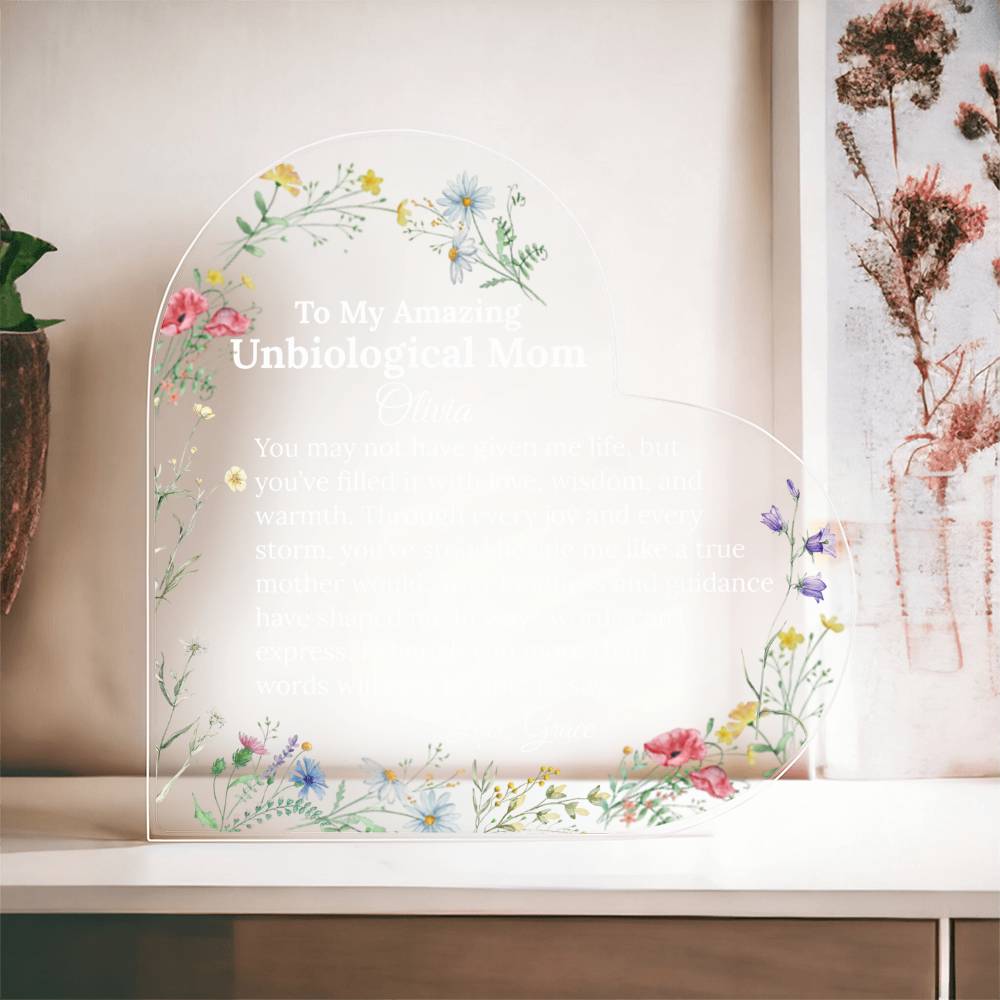 💖 Show your unbiological mom how much she means to you with our personalized heart-shaped acrylic plaque! This elegant piece features a beautifully clear acrylic base with intricate floral designs that add a touch of nature and warmth. Perfect for displaying on desks, shelves, or any special place in her home.