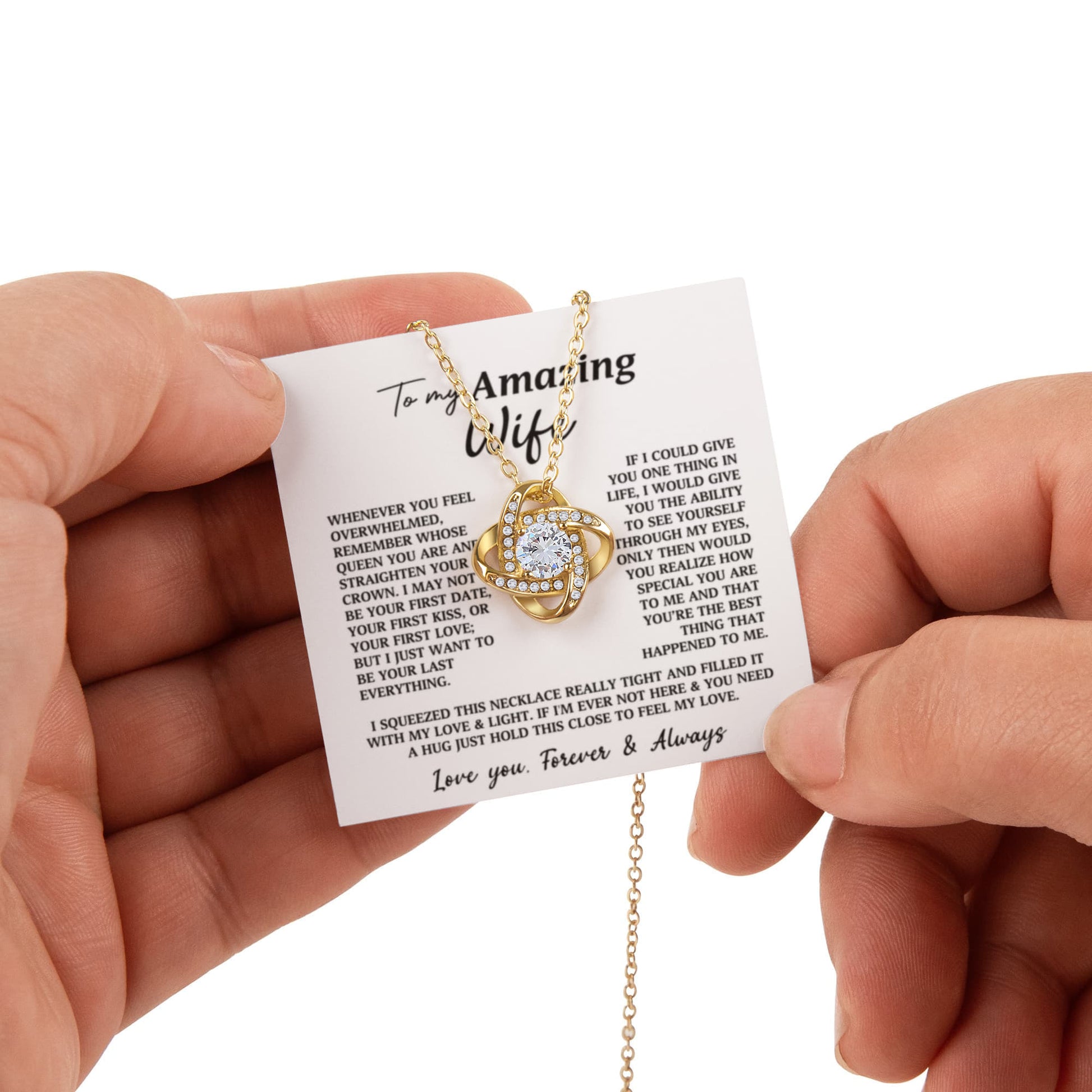 Imagine her reaction as she receives this beautiful Love Knot Necklace. Representing an unbreakable bond between two souls, this stunning pendant is adorned with premium cubic zirconia crystals, making it a timeless symbol of love and devotion. The luxurious box, featuring a meticulously preserved rose that never fades, adds an extra touch of love. With a simple turn of the gold knob, her breathtaking gift is revealedโmaking it the perfect sentimental gift for that special someone.
