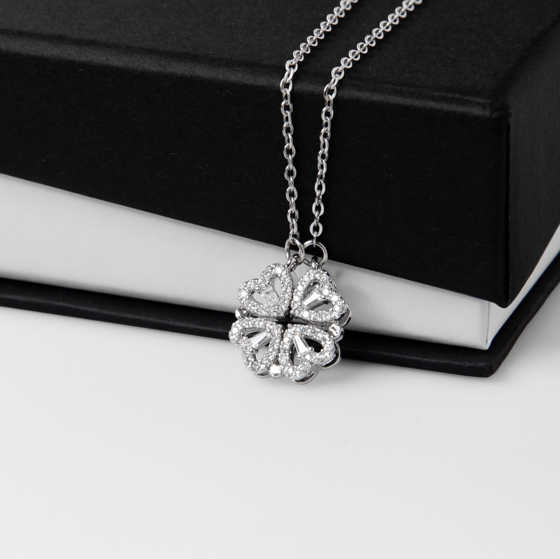The Magnetic Hearts Necklace features four crystal-embellished hearts that come together to form a beautiful lucky clover. The hidden magnetic design allows each heart to connect seamlessly—symbolizing connection, unity, and the moments that bring us together.