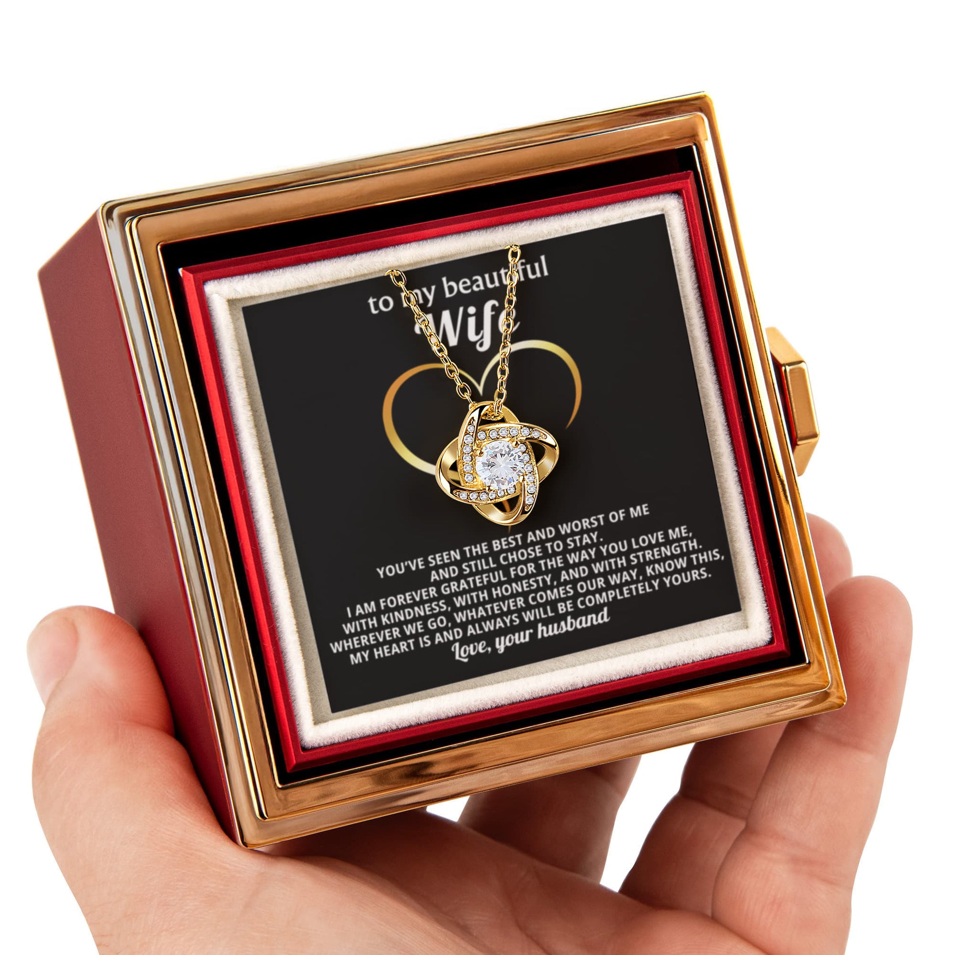 Imagine her reaction as she receives this beautiful Love Knot Necklace. Representing an unbreakable bond between two souls, this stunning pendant is adorned with premium cubic zirconia crystals, making it a timeless symbol of love and devotion. The luxurious box, featuring a meticulously preserved rose that never fades, adds an extra touch of love. With a simple turn of the gold knob, her breathtaking gift is revealedโmaking it the perfect sentimental gift for that special someone.